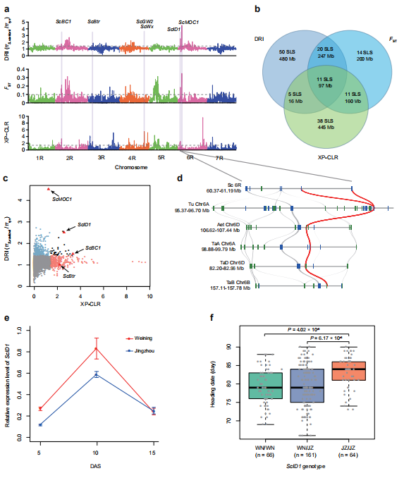 對馴化基因的分析可以促進(jìn)對作物性狀的理解和改良,但在黑麥中這類(lèi)基因的分子分析方面進(jìn)展甚微。作者通過(guò)全基因組選擇清除分析,利用在栽培黑麥和瓦維洛夫黑麥(S. vavilovii)之間鑒定的123647個(gè)SNPs,挖掘黑麥馴化相關(guān)染色體區域和基因座。DRI、FST、XP-CLR分析中,共同識別到11個(gè)選擇信號(圖7a-c)。通過(guò)與水稻和大麥的共線(xiàn)性比較,發(fā)現了一些可能的選擇清除位點(diǎn),包括已在水稻或大麥中已被功能分析的ScBC1、ScBtr、ScGW2、ScMOC1、ScID1和ScWx的同源基因(圖7a-c)。