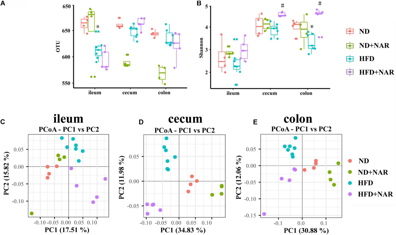除HFD組回腸、盲腸和結腸的OTUs較ND組降低外,4組腸道不同部位的細菌OTUs無(wú)明顯差異(圖5A)。添加NAR降低了ND組小鼠盲腸和結腸OTUs。Shannon多樣性結果表明,高脂飼喂降低了結腸細菌多樣性,而NAR增加了盲腸和結腸細菌多樣性(圖5B)。高脂飼喂和NAR對回腸細菌多樣性沒(méi)有影響。