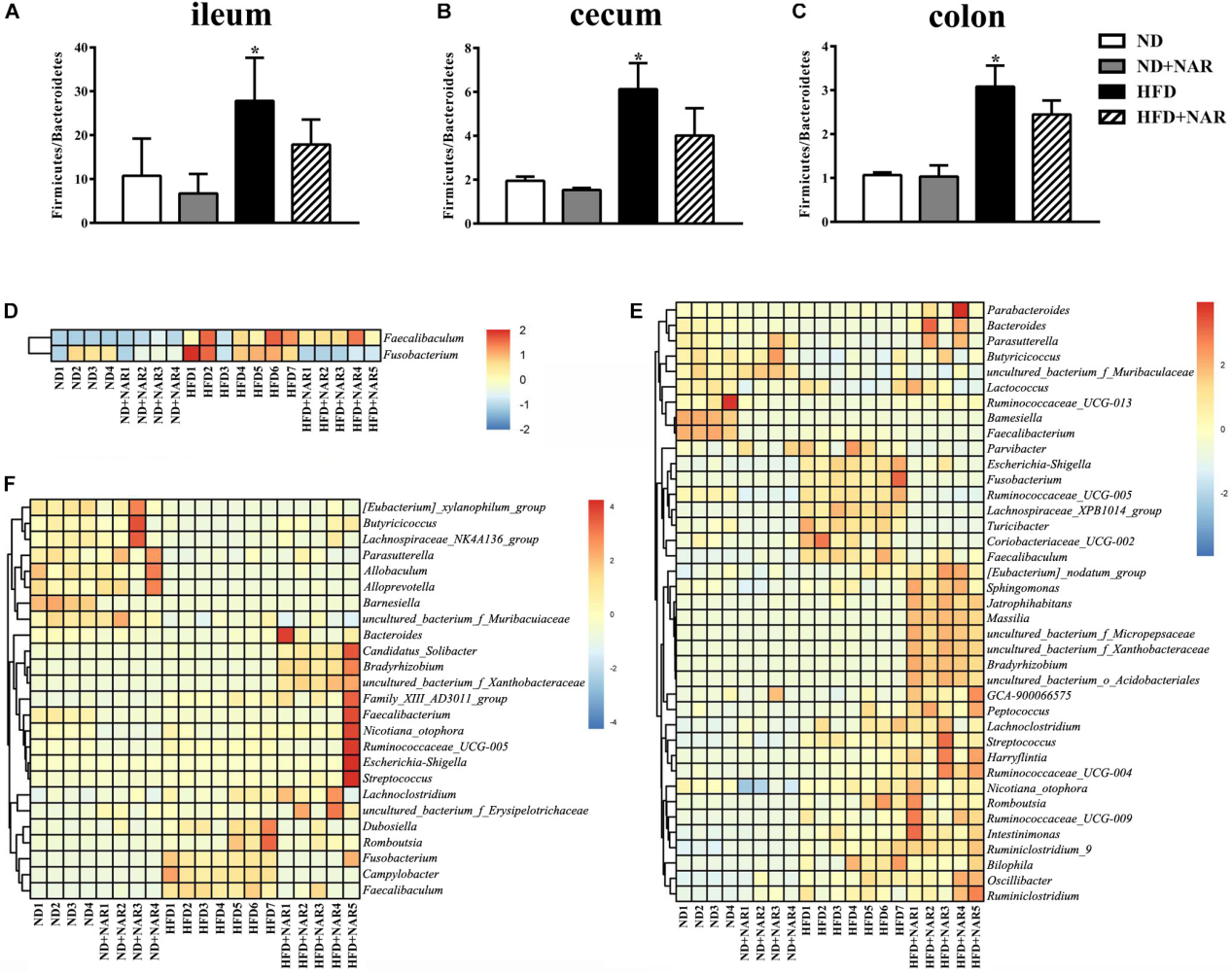 PCoA分析顯示,各處理組回腸、盲腸和結腸中細菌組成具有明顯差異(圖5C-E)。與ND組相比,HFD增加了厚壁菌門(mén)/擬桿菌門(mén)(Firmicutes/Bacteroidetes)比值,HFD+NAR組NAR增加了厚壁菌門(mén)/擬桿菌門(mén)比值(圖6A-C)。因此NAR影響了腸道菌群組成。