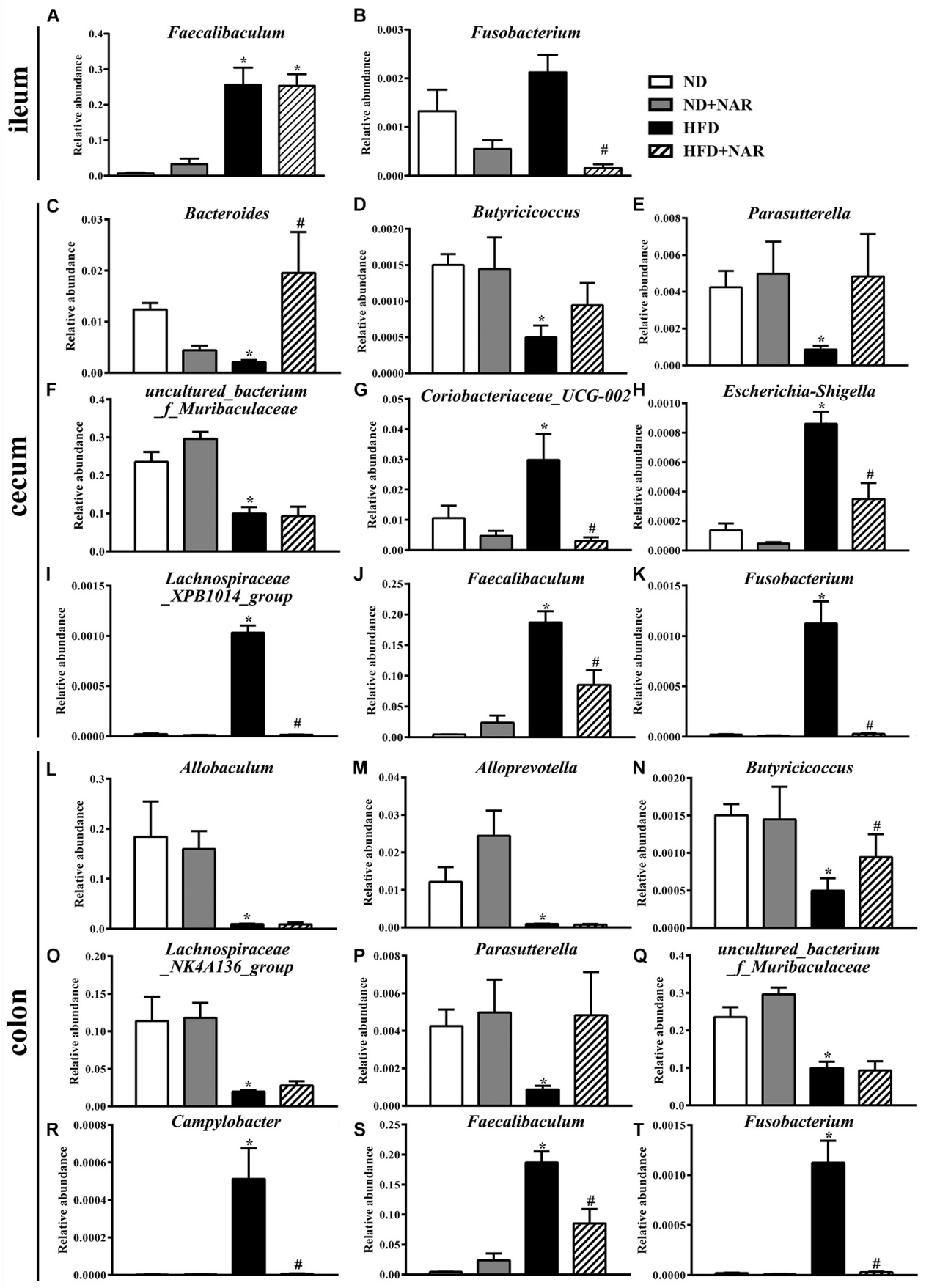 優(yōu)勢菌屬和差異菌屬熱圖顯示,補充N(xiāo)AR改變了HFD誘導的腸道細菌變化(圖6D-F)。與ND組相比,HFD組盲腸中Coriobacteriaceae_UCG-002、Escherichia-Shigella、Faecalibaculum、Fusobacterium、Lachnospiraceae_XPB1014_group、Parvibacter、Ruminococcaceae_UCG-005和Turicibacter相對豐度較高,Campylobacter、Dubosiella、Faecalibaculum和Fusobacterium在結腸中相對豐度較高,Bacteroides在盲腸中相對豐度較低,Butyricicoccus在結腸中相對豐度較低。NAR處理逆轉了這些效果。與ND組相比HFD飼喂小鼠腸道菌群顯示Butyricicoccus、Parasutterella和uncultured_bacterium_f_Muribaculaceae在盲腸中相對豐度較低,Allobaculum、Alloprevotella、Lachnospiraceae_NK4A136_group、Parasutterella和uncultured_bacterium_f_Muribaculaceae在結腸中相對豐度較低,Faecalibaculum在回腸中相對豐度較高。HFD+NAR組Bradyrhizobium、[Eubacterium]_nodatum_group、GCA-900066575、Jatrophihabitans、Massilia、Peptococcus、Sphingomonas、uncultured_bacterium_o_Acidobacteriales、uncultured_bacterium_f_Micropepsaceae和uncultured_bacterium_f_Xanthobacteraceae在盲腸中相對豐度較高,Bacteroides、Bradyrhizobium、Candidatus_Solibacter和 uncultured_bacterium_f_Xanthobacteraceae在結腸中相對豐度較高,Fusobacterium在回腸中相對豐度較低。圖7為相對豐度改變的細菌統計結果,這些結果表明NAR調節了HFD小鼠腸道細菌。
