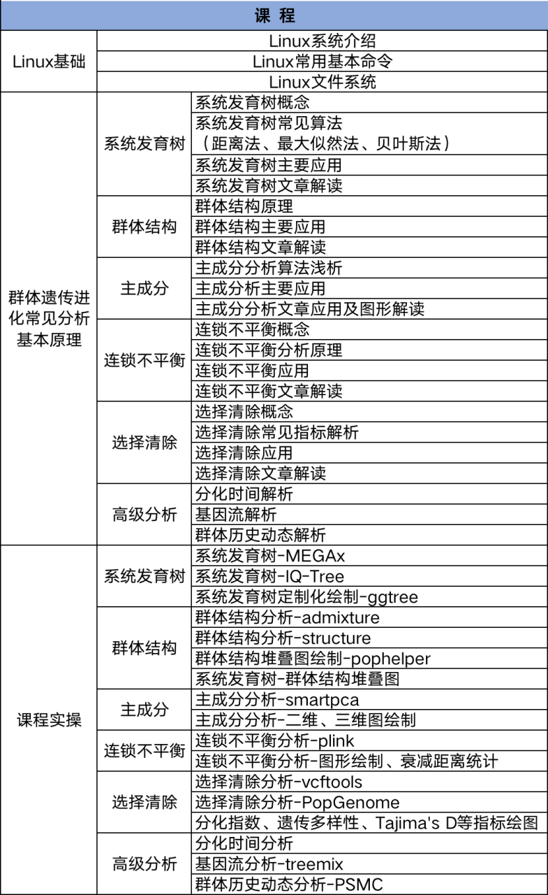 應各位老師需求,百邁客特開(kāi)辦遺傳進(jìn)化生信分析培訓班,面向全體科研工作者,系統學(xué)習遺傳進(jìn)化中常規內容,并重點(diǎn)進(jìn)行高級圖形繪制。課程設計覆蓋基因流、分化時(shí)間、群體歷史動(dòng)分析三塊當前熱點(diǎn)研究?jì)热荨?/p>
