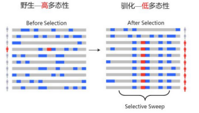 自然選擇促使有利突變在群體中保留下來(lái),與之連鎖的中性位點(diǎn)突變頻率提升,非連鎖的中性位點(diǎn)突變頻率下降;簡(jiǎn)單的說(shuō)就是基因組某區域由于受到了選擇而消除多態(tài)性,即遺傳多樣性降低,在群體中出現高頻的等位基因和低頻的等位基因。