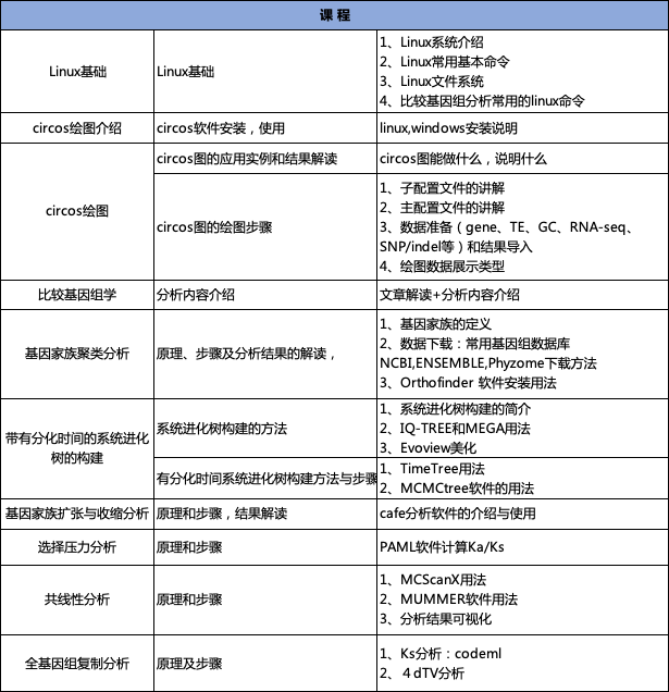 隨著(zhù)測序技術(shù)的發(fā)展及測序成本的降低,越來(lái)越多的物種完成了基因組的組裝,這為多物種比較基因組學(xué)分析提供了大量的可用基因組資源。為了協(xié)助科研工作者對基因組結果進(jìn)行深度挖掘,本課程將從基礎生信操作開(kāi)始,從已發(fā)表的NG、NC等高水平文章入手,帶領(lǐng)大家學(xué)習比較基因組學(xué)常用的分析方法,從而滿(mǎn)足文章后期發(fā)表的需求,同時(shí)也為我們生物信息科學(xué)工作者們提供一個(gè)互相交流的平臺。