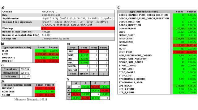 SnpEff 軟件通過(guò)基因組結構注釋數據(GTF/GFF文件),對VCF文件中的SNP/InDel信息進(jìn)行注釋?zhuān)粗饕忉屃薙NP/InDel是否能夠對編碼蛋白基因造成影響。SnpEff自帶大量已經(jīng)發(fā)表的基因組的信息,可以快速利用已發(fā)表的基因組信息進(jìn)行SNP/InDel位點(diǎn)的注釋分析。對于未收錄的基因組,SnpEff也提供了標準流程來(lái)構建對應的分析數據庫。