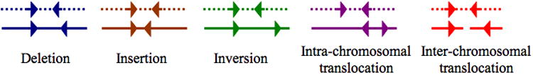高通量測序數據除了可以分析SNP/InDel位點(diǎn)外,還可以利用雙端測序的中的插入片段長(cháng)度信息和比對時(shí)出現的異常比對結果,對測序樣本中可能存在的結構變異進(jìn)行分析。本次課程主要利用BreakDancer這款軟件進(jìn)行結構變異位點(diǎn)的分析,軟件主要預測了五種類(lèi)型的結構變異:插入、缺失、倒位、染色體間和染色體內易位,