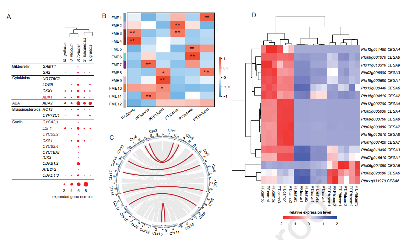 植物的形態(tài)發(fā)生和生長(cháng)速率可能歸因于細胞增殖和分裂、細胞壁形成以及光合效率或其他生物過(guò)程的增強。細胞分裂素生物合成中的四個(gè)基因家族和細胞周期調控中的十個(gè)基因家族,通過(guò)串聯(lián)基因復制或最近的WGD發(fā)生顯著(zhù)擴增(圖2A)。在泡桐屬植物中,白花泡桐(PF)的生長(cháng)速度遠遠快于毛泡桐(P. tomentosa,?PT)。約85%的毛泡桐基因cDNA可定位于白花泡桐基因組,因此對白花泡桐和毛泡桐的葉片、樹(shù)干韌皮部和樹(shù)干形成層進(jìn)行了比較轉錄組學(xué)分析。WGCNA分析得到12個(gè)潛在快速生長(cháng)相關(guān)ME(FME1~12),FME3與毛泡桐和白花泡桐形成層的生長(cháng)發(fā)育相關(guān)(圖2B)。FME3模塊包括42個(gè)參與植物激素途徑或參與細胞周期調控的基因。FME4僅在白花泡桐中與形成層生長(cháng)和發(fā)育高度相關(guān)(圖2B),這個(gè)模塊中有五個(gè)基因與激素信號有關(guān),其中包括參與細胞分裂素代謝的腺苷激酶1,且這些基因在白花泡桐中顯著(zhù)擴增。通過(guò)基因的表達及拷貝數分析表明,CESAs、Csls和木質(zhì)素生物合成基因可能在白花泡桐的發(fā)生中起作用(圖2D)。