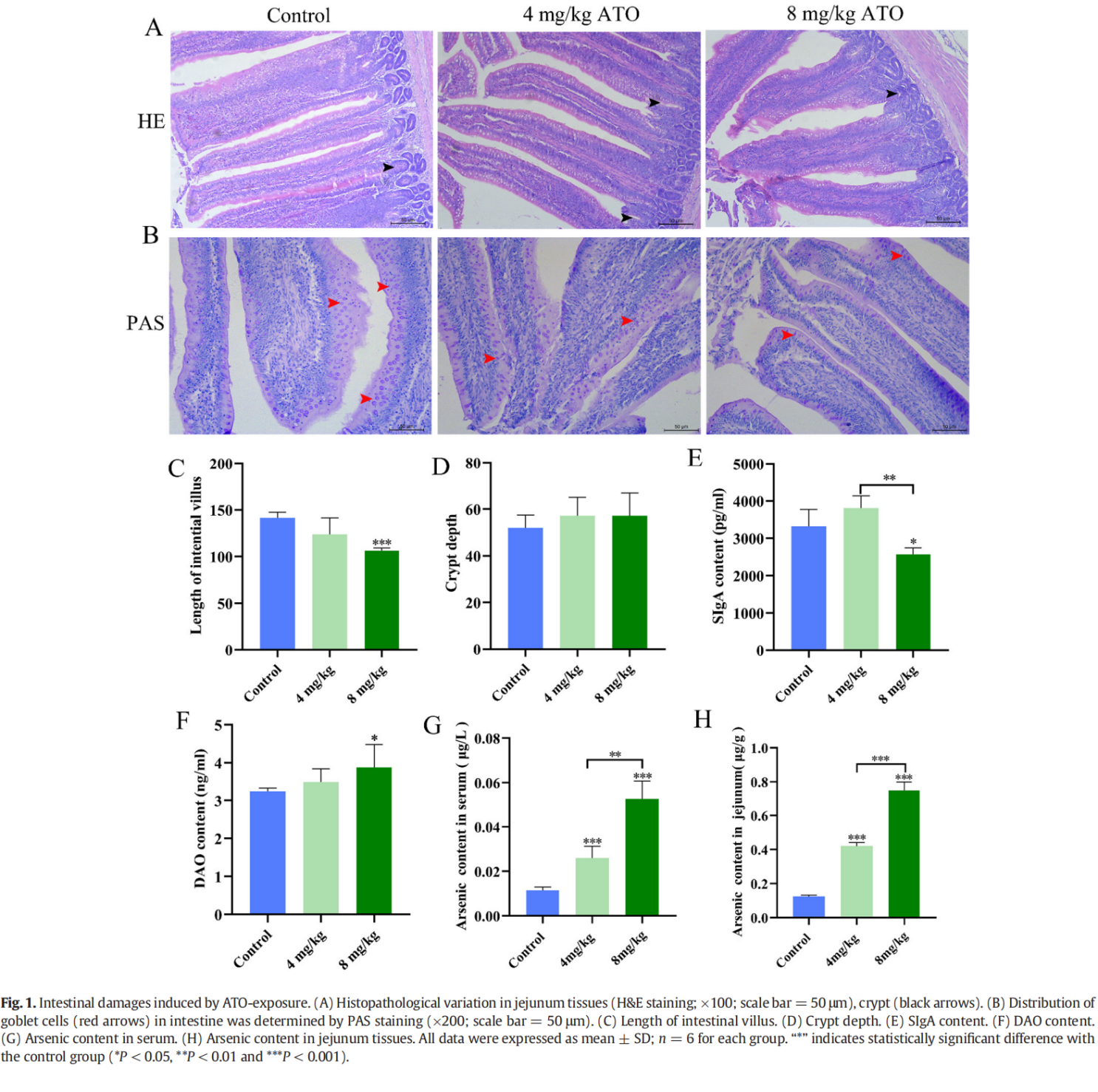 如圖?1G-H?所示,鴨空腸和血清中砷濃度呈劑量依賴(lài)性增加。與對照組相比,所有ATO治療組血清和空腸組織中砷含量均顯著(zhù)升高(P < 0.001)。此外,8 mg/kg ATO?組的砷水平顯著(zhù)高于?4 mg/kg ATO?治療組(P < 0.01?或?P < 0.001)。