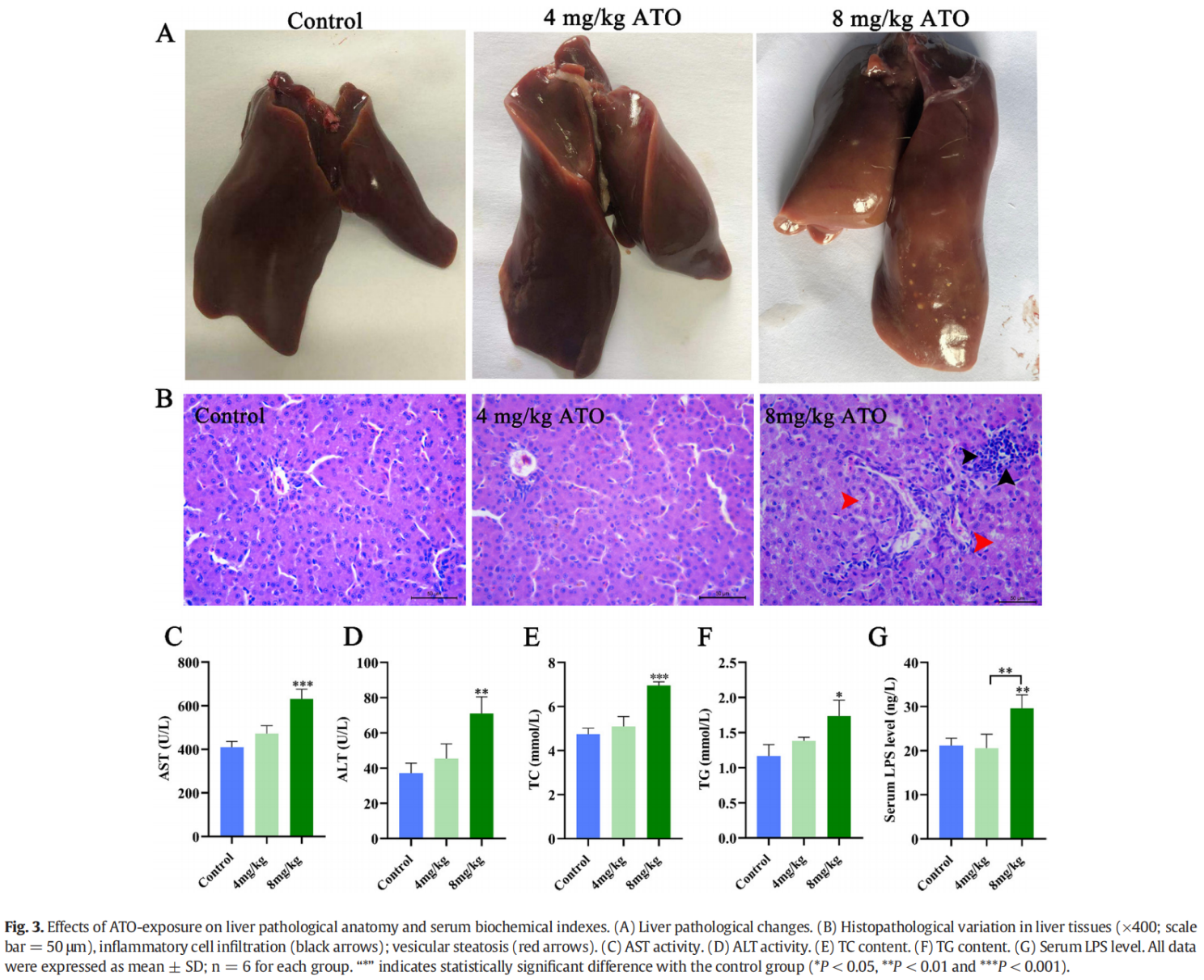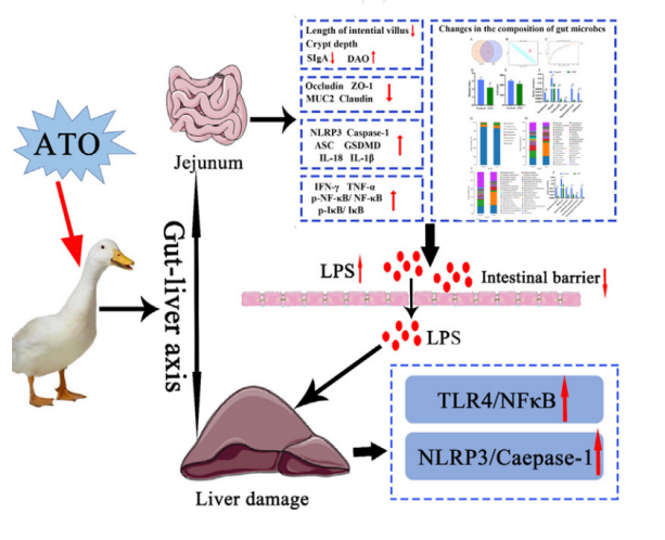 砷元素廣泛存在于自然界中,砷及砷化合物是常見(jiàn)的有毒有害類(lèi)污染物,常見(jiàn)于受污染的土壤、河流和地下水中。然而,關(guān)于三氧化二砷?(ATO)?對水禽的腸-肝軸和隨之而來(lái)的肝毒性的影響的研究很少。在此,我們研究了?ATO?對鴨腸和肝臟的影響,并探討了腸肝軸在?ATO?誘導的肝毒性和腸道毒性中的作用。結果表明,ATO?暴露會(huì )導致腸道損傷、肝臟炎癥細胞浸潤和囊泡脂肪變性。此外,暴露于?ATO?的鴨子的腸道微生物群落顯示出顯著(zhù)降低的α多樣性和細菌群落的改變。并且,ATO?暴露顯著(zhù)降低了腸道屏障相關(guān)蛋白(Claudin-1、MUC2、ZO-1?和?Occludin)的表達,導致腸道通透性增加和脂多糖水平升高。同時(shí),ATO?暴露還上調肝臟和空腸中與細胞凋亡相關(guān)的指數水平,并增加促炎細胞因子的產(chǎn)生(IFN-γ、TNF-α、IL-18?和?IL-1β)。我們進(jìn)一步的機制研究表明,ATO?誘導的肝臟和空腸炎癥是由?LPS/TLR4/NF-κB?信號通路和?NLRP3?炎癥小體的激活引起的??傊?,這些結果表明ATO暴露可引起肝臟和空腸炎癥和細胞凋亡,間接腸肝軸通路可能在A(yíng)TO誘導肝毒性的潛在機制中起重要作用