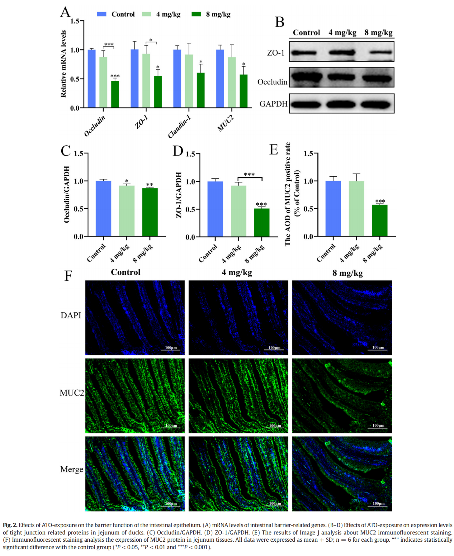為了研究?ATO?暴露是否通過(guò)破壞腸道屏障來(lái)增加組織毒性,我們評估了腸道屏障標志物。圖?2A-D?顯示了腸道屏障相關(guān)基因和蛋白質(zhì)。與對照組相比,8 mg/kg ATO組Occludin、ZO-1、Claudin-1和MUC2的mRNA水平顯著(zhù)下調(P < 0.05或P < 0.001)。此外,8 mg/kg ATO?組中?Occludin?和?ZO-1?的?mRNA?水平顯著(zhù)低于?4 mg/kg ATO?組(P < 0.05?或?P < 0.001)。同樣,與對照組相比,所有?ATO?治療組的?Occludin?蛋白水平顯著(zhù)降低(P < 0.05?或?P < 0.01)。與對照組和4 mg/kg ATO組相比,8 mg/kg ATO組的ZO-1蛋白水平也明顯降低(P < 0.001)。同時(shí),MUC2?抗體的免疫熒光顯示?ATO?降低了鴨空腸組織中的?MUC2?熒光強度(圖?2E-F)。