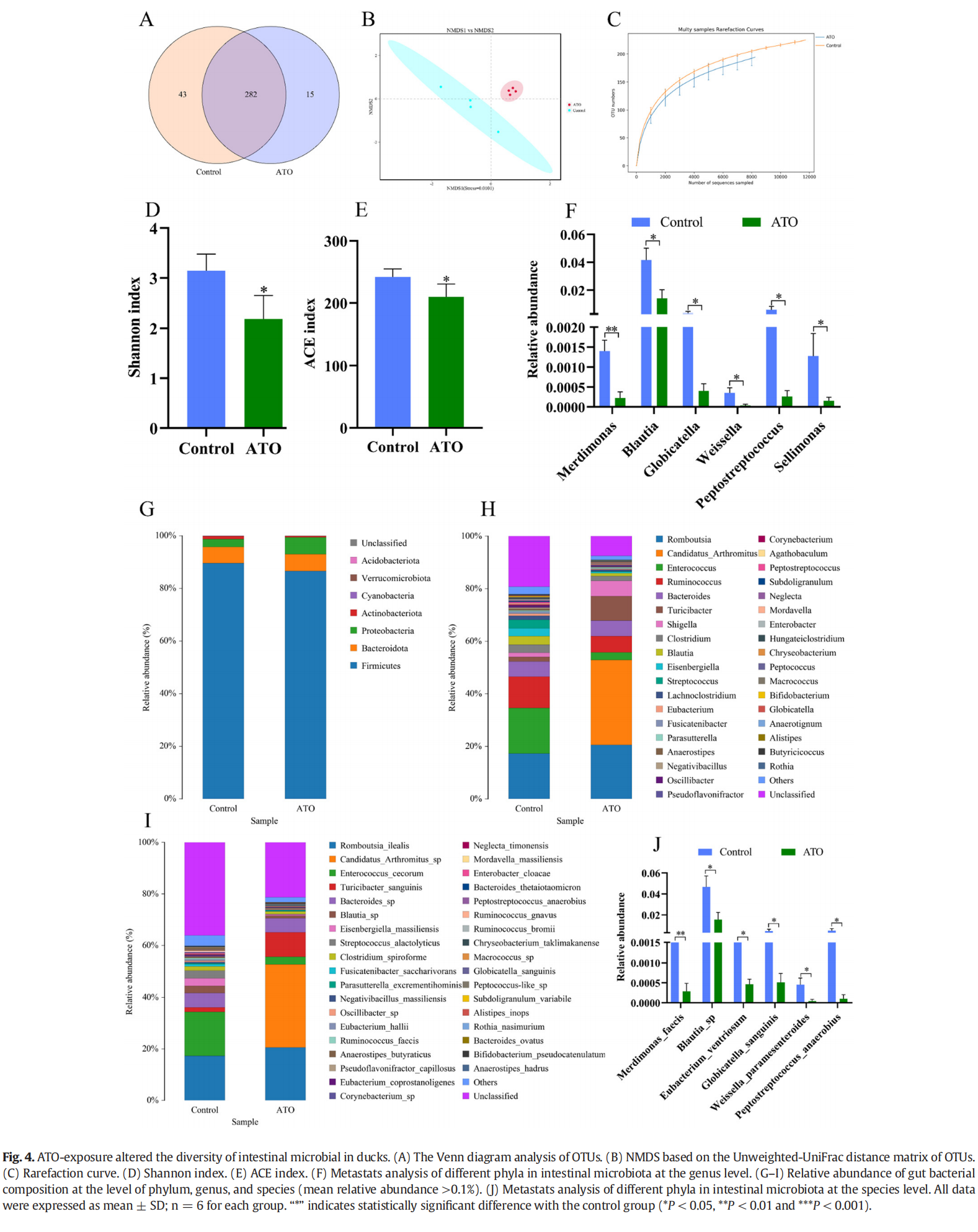 α?和?β?多樣性分析都用于評估對照組和?ATO?治療組之間腸道細菌群落多樣性的差異。如圖?4B?所示,NMDS?分析用于分析各組之間的?β-多樣性,ATO?治療組和對照組之間的腸道微生物群分布分別與每組聚類(lèi)。此外,物種稀釋性曲線(xiàn)趨于相對平坦,說(shuō)明測序數量和深度符合后續分析的要求(圖4C)。腸道微生物種群的α多樣性通過(guò)群落豐度(ACE)和多樣性指數(香農指數)來(lái)反映。與對照組相比,ATO?暴露顯著(zhù)降低了?ACE?和香農指數(P < 0.05,圖?4D-E),這表明?ATO?暴露顯著(zhù)改變了鴨腸道微生物的豐富度和多樣性。