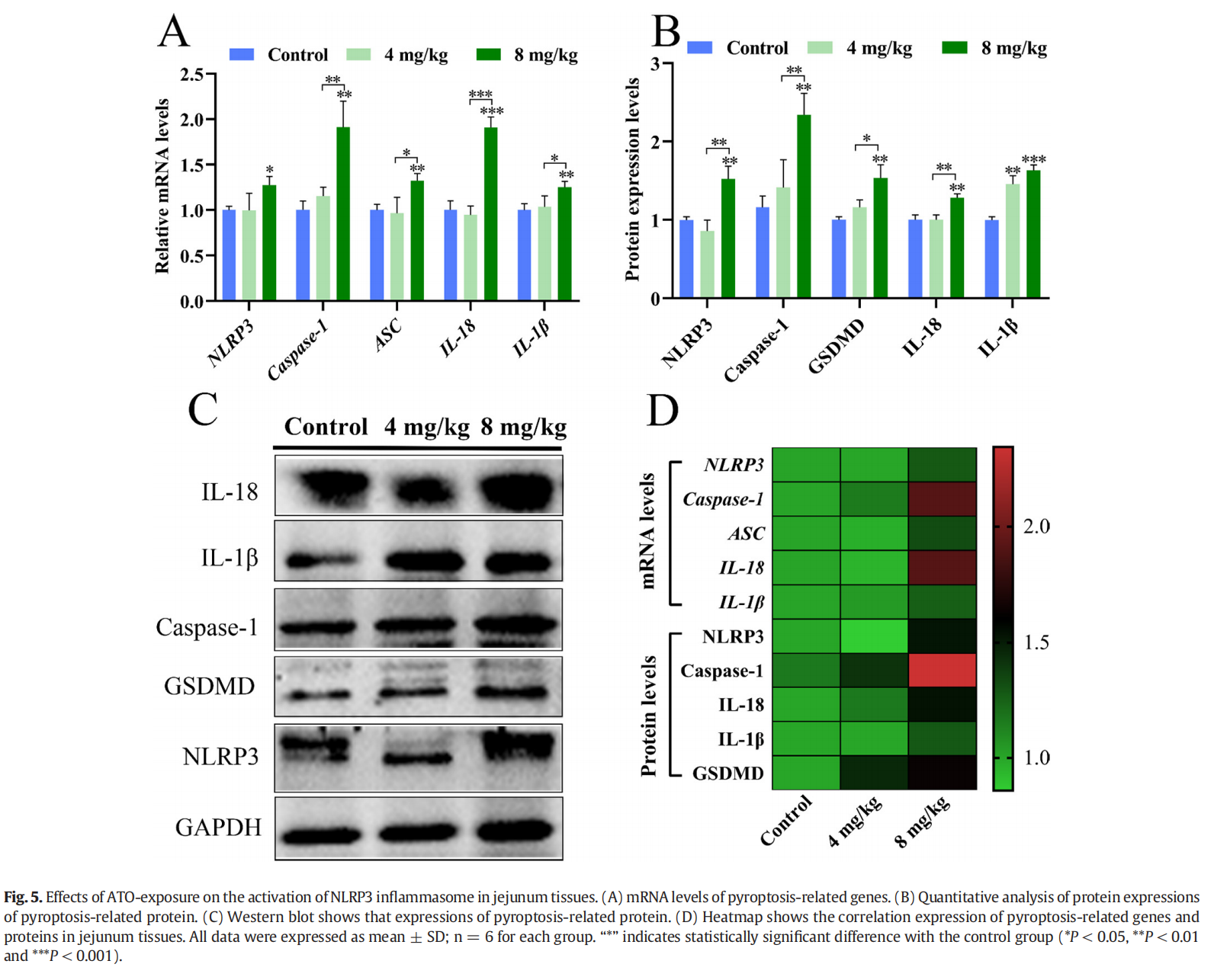 為了評估?ATO?誘導的炎癥小體激活是否與腸道損傷有關(guān),我們檢查了炎癥小體激活標志物的表達水平。從圖?5A?可以看出,NLRP3、Caspase-1、ASC、IL-1β?和?IL-18?的?mRNA?表達水平隨著(zhù)?ATO?水平的增加而升高,與對照相比,8 mg/kg ATO?組和?4 mg/kg ATO?組出現顯著(zhù)差異?(P < 0.05?或?P < 0.01?或?P < 0.001)。同時(shí),NLRP3、Caspase-1、GSDMD、IL-1β?和?IL-18?的蛋白質(zhì)濃度在?8 mg/kg ATO?組中也顯著(zhù)增加(P < 0.01?或?P < 0.001,圖?5B-C)。這些基因和蛋白質(zhì)的變化在熱圖中直觀(guān)地顯示出來(lái)(圖?5D)。這些結果表明,ATO?處理引發(fā)了鴨空腸組織中?NLRP3?炎癥小體的激活和細凋亡。