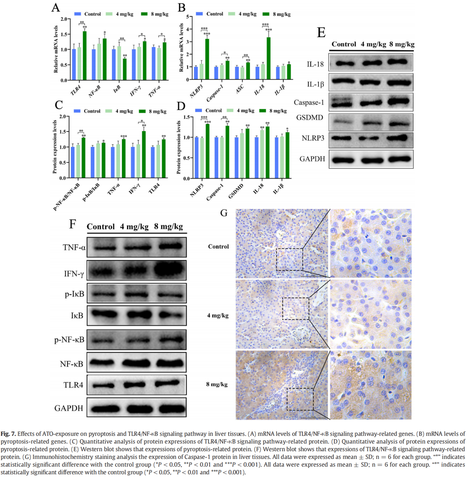 為了進(jìn)一步研究?ATO?暴露對鴨肝炎癥反應的影響,我們檢測了?TLR4/NF-κB?相關(guān)基因的?mRNA?水平。如圖?7A?所示,與對照組和?4 mg/kg ATO?組相比,8 mg/kg ATO?組中?TLR4、NF-κB、IFN-γ?和?TNF-α?的?mRNA?水平顯著(zhù)上調(?P < 0.05?或?P < 0.01),而?IκB mRNA?水平顯著(zhù)下調(P < 0.05)。此外,與對照組相比,治療組的?TLR4、p-NF-κB/NF-κB、p-IκB/IκB、TNFα?和?IFN-γ?蛋白水平顯著(zhù)升高(P < 0.05?或?P < 0.01或?P < 0.001;圖?7C, F)。與?4 mg/kg ATO?組相比,8 mg/kg ATO?組的?p-NF-κB/NF-κB?和?IFN-γ?蛋白水平顯著(zhù)增加(P < 0.05?或?P < 0.01?圖?7C,F)。為了探索?ATO?誘導肝損傷的機制,我們進(jìn)行了進(jìn)一步的實(shí)驗以確定肝損傷是否與細胞凋亡有關(guān)。如圖?7B?所示,與對照組相比,8 mg/kg ATO?暴露后?NLRP3、Caspase-1、ASC、IL-1β?和?IL-18?的?mRNA?表達顯著(zhù)增強(P < 0.05?或P < 0.01?或?P < 0.001)。類(lèi)似地,與對照組和?4 mg/kg ATO?組相比,8 mg/kg ATO?治療組的?NLRP3?和?Caspase-1?的蛋白質(zhì)水平顯著(zhù)增加(P < 0.01?或?P < 0.001;圖?7D-E,G)。此外,與對照組相比,8 mg/kg ATO?組的?GSDMD、IL-1β?和?IL-18?的蛋白質(zhì)水平顯著(zhù)增加(P < 0.05?或?P < 0.01;圖?7D-E)。因此,暴露于?8 mg/kg ATO?會(huì )在鴨肝組織中引起顯著(zhù)的炎癥反應和細胞凋亡。