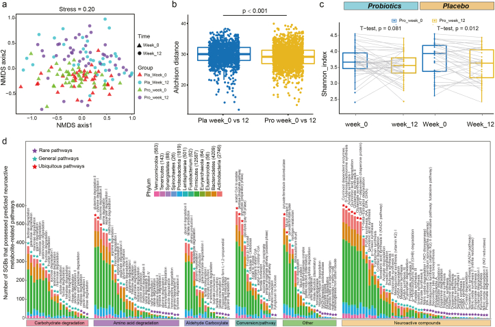 益生菌 (pro) 和安慰劑 (pla) 組在兩個(gè)時(shí)間點(diǎn)的預測腸道代謝組之間的差異。(a) 非度量多維標度(NMDS,Bray-Curtis 相似性指數)和(b)對在第 0 周和第 12 周對兩組受試者的預測微生物組和代謝組進(jìn)行了Procrustes 分析,表明顯示微生物組學(xué)和代謝組學(xué)特征之間的正協(xié)同性(correlation = 0.386;P??= 0.001)。(c) 益生菌組第 0 周和第 12 周之間預測的差異神經(jīng)活性代謝物。p 值經(jīng) FDR 法校正,閾值 P < 0.05 表示顯著(zhù)。