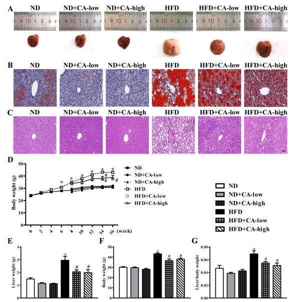 ND組小鼠隨機分為3組(n = 10),飼喂特定飼料,為期8周。這些組包括:1)喂食正常食物的ND小鼠;2)低ND+CA,喂食CA含量為0.08%的正常鼠糧;3)高ND+CA,喂食CA含量為0.16%的正常飼料。同時(shí),高脂飲食組按以下飼料隨機分為3組(n = 10),飼養期8周。這些組包括1)高脂飲食小鼠;2) HFD+CA-low組,高脂日糧中添加0.08% CA;3) HFD+CA高組,飼喂添加0.16% CA的高脂飼糧,每2周測量體重。