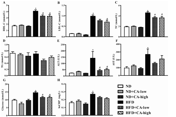? ? ? ? ?血清TC、TG、HDL-C和LDL-C升高是HFD組小鼠的主要特征。同樣,HFD組小鼠血清TC、HDL- C、LDL-C水平明顯升高,提示小鼠出現高脂血癥。CA處理在低和血清TC、TG、HDL-C和LDL-C升高是HFD組小鼠的主要特征。同樣,HFD組小鼠血清TC、HDL- C、LDL-C水平明顯升高,提示小鼠出現高脂血癥。CA處理在低和低濃度的TC、HDL-C和LDL-C對hfd誘導的血清高脂血癥有緩解作用。但各組間血清TG水平無(wú)顯著(zhù)差異(圖2A-D)。在HFD組中,ALT、AST、葡萄糖和hsCRP水平均升高,而在喂食HFD的小鼠中,添加兩種濃度的CA只恢復了血清中ALT和葡萄糖(圖2E-H)。添加CA的ND小鼠與只添加ND的小鼠表現出幾乎相同的結果。