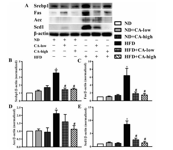 3.補充CA可調節高脂喂養小鼠脂肪生成相關(guān)蛋白表達