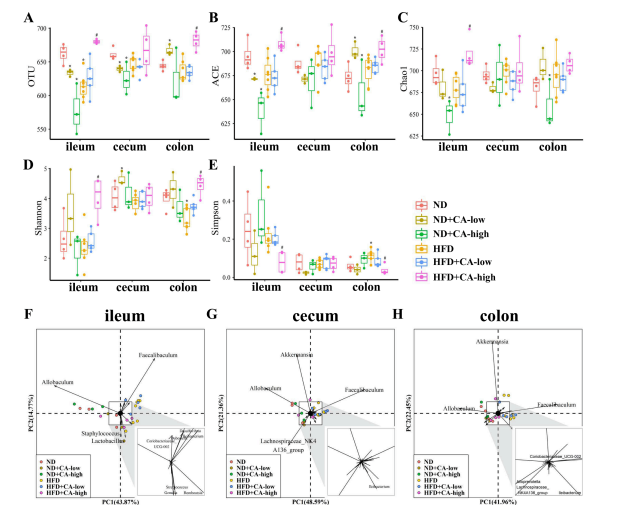 ? ? ? ? 研究了6組中回腸、盲腸、結腸3個(gè)腸段內容物中腸道菌群組成的變化。如圖5A所示,與ND組相比,HFD小鼠回腸腸道菌群中觀(guān)察到的OTUs明顯降低,同時(shí)盲腸和結腸的OTUs也有下降趨勢。添加0.16% CA的HFD組小鼠回腸和結腸OTUs顯著(zhù)增加。有趣的是,在添加0.08% CA的ND組中,除了結腸OTUs的減少外,添加CA可導致正常飼糧小鼠OTUs的減少。進(jìn)行Alpha多樣性分析,包括ACE(圖5B)、Chao1(圖5C)、Shannon(圖5D)和Simpson指數(圖5E)。ACE、Chao1、Shannon和Simpson的變化與OTUs的變化平行,表明HFD破壞了腸道菌群的豐富度和多樣性。同時(shí),添加CA可在一定程度上恢復植物區系的豐富度和多樣性,尤其是在HFD中添加0.16% CA時(shí)。在ND組中添加CA導致了微生物群落豐富度和多樣性的降低,表明其作用可能與HFD組不同。此外,已知多酚可以下調微生物多樣性,顯著(zhù)抑制致病菌的生長(cháng);因此,添加CA的ND組細菌OTU、豐富度和多樣性的降低可能與CA的抑菌作用有關(guān)。利用Beta多樣性分析分析腸道菌群整體結構的變化。主成分分析顯示不同的微生物群組成和單獨的集群之間HFD老鼠和ND老鼠,和HFD老鼠和HFD之間補充高濃度的CA。然而,HFD小鼠的腸道微生物群補充CA濃度較低的不是明顯不同于回腸HFD老鼠,盲腸和結腸。此外,ND處理組間的微生物菌群組成沒(méi)有差異(圖5F、G和H)。PCA識別出回腸、盲腸和結腸中兩個(gè)最易變的菌群——Allobaculum和Faecalibaculum,這意味著(zhù)它們導致了組間觀(guān)察到的差異。PCA結果顯示,PC1(48.59%)具有a盲腸總方差高于PC2(21.36%),說(shuō)明CA處理可使hfd誘導的腸道菌群組成與ND組相似。通過(guò)beta多樣性分析,我們發(fā)現CA處理組(特別是添加0.16% CA)和HFD處理組具有不同的菌群組成,提示CA對腸道菌群的修飾作用。