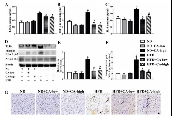 有報道稱(chēng),NAFLD的特征是腸道菌群改變、炎癥和腸道屏障破壞。肝組織炎癥被認為是肝脂肪變性發(fā)展的驅動(dòng)因素,腸道源性脂多糖被認為在肝臟炎癥中具有致病作用。最近的動(dòng)物實(shí)驗研究關(guān)注了腸道菌群LPS在NAFLD發(fā)生中的作用。腸道源性L(fǎng)PS是革蘭氏陰性菌外膜的主要成分,通過(guò)TLR4信號通路和下游炎癥級聯(lián)反應促進(jìn)炎癥反應。有報道稱(chēng),在NAFLD模型中,與野生型小鼠相比,tlr4缺陷小鼠的肝損傷、炎癥和脂質(zhì)積累減少。此外,阻斷腸道菌群與宿主細胞之間的脂多糖- tlr4相互作用可以阻止高脂喂養小鼠NAFLD的啟動(dòng)和發(fā)展,這證實(shí)了脂多糖- tlr4通路在誘導NAFLD中具有非常重要的作用。與之前的研究結果一致,我們的研究表明,16周高脂飲食導致血清LPS和肝臟TLR4表達顯著(zhù)增加,肝組織中磷酸化的NF-kB p65被激活,表明炎癥開(kāi)始。同時(shí),高脂喂養小鼠血清TNF-a、IL-6水平升高,肝臟mpo陽(yáng)性細胞浸潤。所有劑量的CA補充均顯著(zhù)扭轉了上述現象;在添加ca的ND組中沒(méi)有觀(guān)察到顯著(zhù)差異(圖4A-G)。
