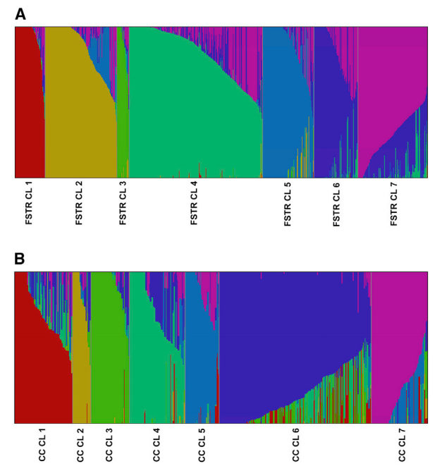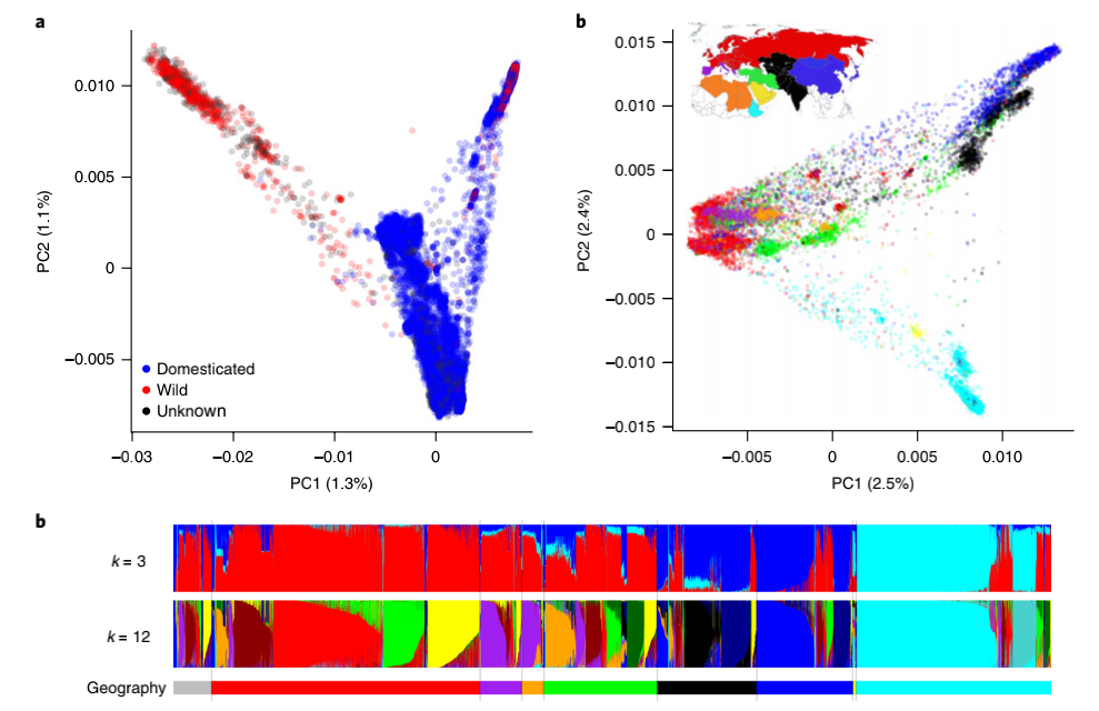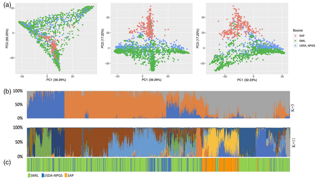 基因庫收集和保存大量植物和詳細的護照信息,目的是保護遺傳多樣性以進(jìn)行保護和育種。此類(lèi)集合的遺傳表征有可能闡明重要作物的遺傳歷史,使用標記-性狀關(guān)聯(lián)來(lái)鑒定感興趣性狀的位點(diǎn),尋找正在進(jìn)行選擇的位點(diǎn),并通過(guò)識別分類(lèi)錯配和重復為基因庫管理作出貢獻。本研究通過(guò)GBS測序對來(lái)自全球基因庫的10,038個(gè)辣椒 (Capsicum spp.) 種質(zhì)進(jìn)行基因分型,并調查了這種標志性主食的近期歷史?;赟NP數據計算了identity-by-state (IBS) 比例,在基因庫內和基因庫之間檢測到多達 1,618 個(gè)重復種質(zhì)。進(jìn)一步深入分析了常見(jiàn)食用辣椒的遺傳多樣性以調查其歷史,發(fā)現在全球廣泛地區收集的辣椒種類(lèi)有很大的重疊。GWAS分析和選擇清除分析發(fā)現辣椒性狀,如刺激性,這些性狀在全球分布不均勻,表明人類(lèi)偏好對馴化辣椒的遺傳結構產(chǎn)生了主要影響。