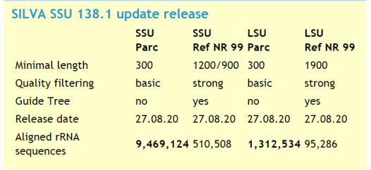 SILVA是一個(gè)包含三域微生物(細菌、古菌、真核)rRNA基因序列的綜合數據庫,其數據庫涵蓋了原核和真核微生物的小亞基rRNA基因序列(簡(jiǎn)稱(chēng)SSU,即16S和18SrRNA)和大亞基rRNA基因序列(簡(jiǎn)稱(chēng)LSU,即23S和28SrRNA)。目前數據庫版本為SILVA 138.1,更新時(shí)間為2020年9月2日,數據庫包含的數據信息見(jiàn)下表1所示。