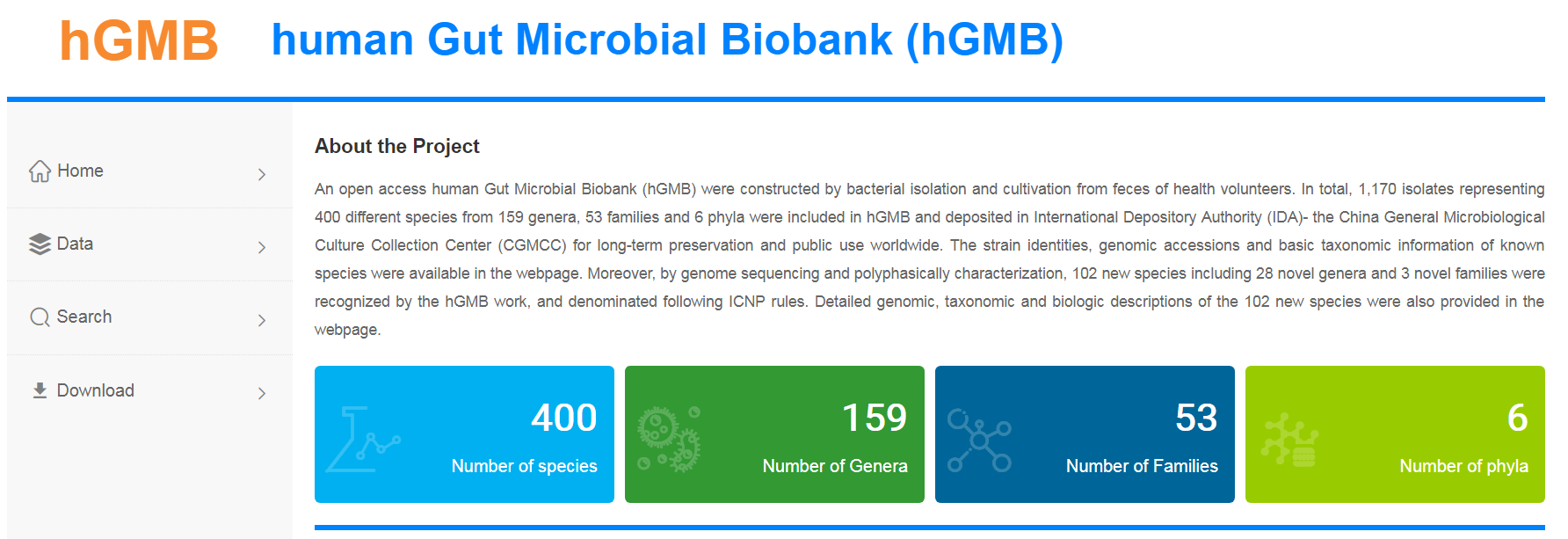 2021年5月,中科院微生物所通過(guò)從健康志愿者糞便中分離培養細菌,構建了一個(gè)開(kāi)放獲取的人類(lèi)腸道微生物庫(hGMB)。數據庫共有1170個(gè)菌株,代表6門(mén)53科159屬400個(gè)不同物種。并保存在國際保存機構(IDA)-中國微生物培養總收集中心(CGMCC),以便在全球范圍內長(cháng)期保存和公共使用。該網(wǎng)站提供了已知物種的菌株身份、基因組材料和基本分類(lèi)信息。根據國際原核生物命名規則,對102個(gè)新種進(jìn)行了特征描述和命名,提出了28個(gè)新屬和3個(gè)新科。hGMB代表了全球人類(lèi)腸道16S rRNA基因擴增子數據(n=11647)中80%以上的常見(jiàn)和優(yōu)勢人類(lèi)腸道微生物屬和種。