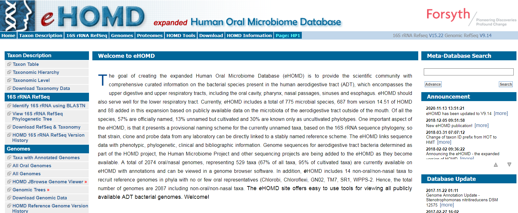 目前,eHOMD共包括775種微生物,其中687種來(lái)自HOMD 14.51版,88種是根據口外空氣消化道微生物群的公開(kāi)可用數據在本次擴展中添加的。在所有物種中,57%是正式命名的,13%是未命名的(但可人工培養),30%是無(wú)人工培養型。eHOMD將序列數據與表型、系統發(fā)育、臨床和文獻信息聯(lián)系起來(lái),共有2074個(gè)口腔/鼻腔基因組,代表529個(gè)分類(lèi)群(占所有分類(lèi)群的67%,占培養分類(lèi)群的95%)。目前可在eHOMD上獲得,并帶有注釋?zhuān)稍诨蚪M瀏覽器軟件中查看。作為HOMD項目、人類(lèi)微生物組項目和其他測序項目的一部分確定的空氣消化道細菌的基因組序列將在可用時(shí)添加到eHOMD中。更新時(shí)間為2020-11-13?版本V9.14。
