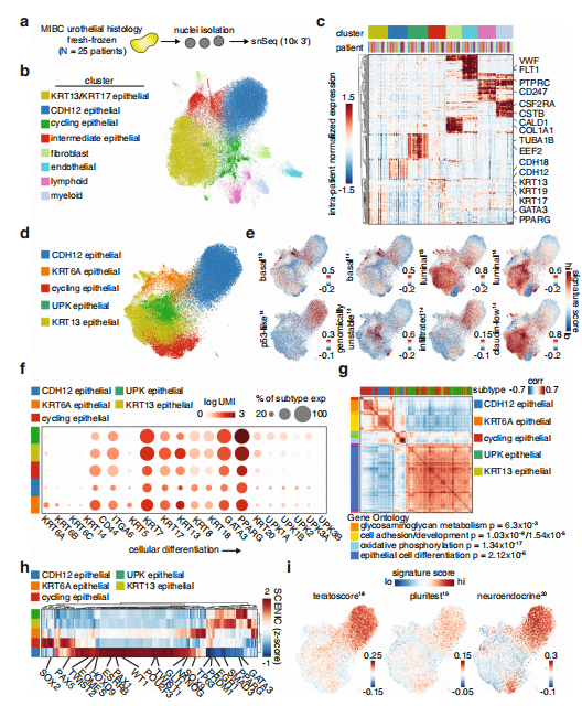為了實(shí)現表征腫瘤內異質(zhì)性的第一個(gè)目標,作者首先基于sn-RNAseq細胞類(lèi)型比例研究了MIBC腫瘤的總體細胞組成(圖1a)。腫瘤由約90%的上皮細胞、5%的免疫細胞、3%的成纖維細胞和2%的內皮細胞組成,這些細胞根據相應的角蛋白、PTPRC、膠原蛋白、PECAM1、VWF等關(guān)鍵標記基因(圖1b)。上皮間室無(wú)監督聚類(lèi)識別到了一個(gè)KRT13和KRT17差異表達的類(lèi)群,KRT13、uroplakins(UPK)、KRT6A細胞周期相關(guān)基因類(lèi)群,以及表達CDH12和其他上皮標記物的細胞群(圖1d)。KRT13和UPK人群是僅有的兩個(gè)缺乏來(lái)自免疫浸潤MIBC的基因標記的人群,這表明在這些人群中富集的腫瘤代表免疫“冷”腫瘤(圖1e)。進(jìn)一步交叉參照傳統的尿上皮分化相關(guān)標記表明,KRT13和UPK群體代表一個(gè)更分化的表型,而CDH12、KRT6A和cycle群體代表一個(gè)未分化或去分化的表型(圖1f)。如預期一樣KRT13和UPK群體表達了一個(gè)上皮細胞分化網(wǎng)絡(luò )(圖1g)?;趩渭毎{控網(wǎng)絡(luò )推斷和聚類(lèi)分析,預測CDH12群體表現出多種發(fā)育相關(guān)轉錄因子的高活性,包括NANOG、EOMES、PAX1和HOXD9(圖1h)。CDH12和循環(huán)群體在干-樣和神經(jīng)內分泌基因標簽得分也高(圖1i)。