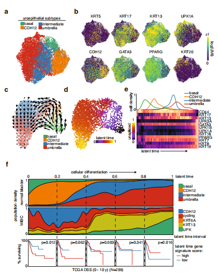上皮細胞的無(wú)監督聚類(lèi)分為基礎、過(guò)渡和傘部類(lèi)群(圖2a)。有趣的是CDH12群體與后一類(lèi)典型群體明顯不同,而過(guò)渡群體的KRT13和KRT17表達水平最高(圖2b)。確定了一個(gè)始于基礎細胞的軌跡,隨后分化為兩種途徑:一種貫穿CDH12群體,一種跳過(guò)CDH12群體(圖2c和d)。關(guān)鍵的尿上皮分化標記物沿著(zhù)這條路徑跟蹤,在起始階段CD44高表達,隨后中間是KRT13和KRT17,終點(diǎn)站為UPK1A、GATA3、PPARG(圖2e)。所有4個(gè)正常樣本的擬時(shí)序分析顯示出相似的路徑,CDH12群位于起始點(diǎn)附近(圖2f)。為了確定CDH12腫瘤細胞與正常腫瘤細胞之間的轉錄相似性,并推斷它們在正常上皮細胞分化軌跡上的位置,作者使用表達相似性,確定了每個(gè)MIBC上皮細胞中最接近的正常細胞,然后給腫瘤細胞分配相應的正常潛伏期(圖2f)。值得注意的是,最未分化表型對應的間隔得分預測了較差的疾病特異性生存(DSS),而最分化表型對應的間隔得分預測了較好的DSS,中間的間隔得分顯示了相反結果之間的過(guò)渡(圖2f)。