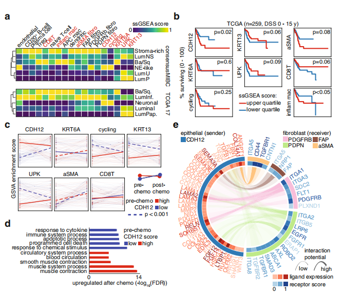 術(shù)前新輔助化療(NAC)和免疫檢查點(diǎn)治療(ICT)已經(jīng)徹底改變了膀胱癌的治療。然而,從這些模式中獲益最多的患者分層仍然是一個(gè)主要的臨床挑戰。作者將人類(lèi)膀胱癌的單細胞核轉錄組、空間轉錄組和單細胞分辨率的空間蛋白組聯(lián)合分析,確定具有治療反應預測能力的上皮細胞亞群。這些細胞表達Cadherin12(CDH12,N-Cadherin 2?)、catenins和其他上皮細胞的標志物。CDH12富集的腫瘤可以定義患者是否接受NAC治療后預后效果差。富集CDH12的腫瘤對ICT表現出更好的效果。在所有情況下,通過(guò)對腫瘤CDH12富集進(jìn)行患者分層比目前膀胱癌亞型能更好的預后預測。CDH12群體類(lèi)似于一種未分化的狀態(tài),具有固有的侵略性生態(tài)學(xué),包括化學(xué)耐藥性可能是通過(guò)祖細胞樣基因表達和成纖維細胞激活介導的。CDH12富集細胞表達PD-L1和PD-L2以及耗竭T細胞共定位,可能通過(guò)CD49a(ITGA1)介導,為ICT在腫瘤中的功效提供一種解釋??傊?,本研究描述了一個(gè)對膀胱癌治療具有反向應答的癌細胞群。重要的是還為臨床標志物的篩選提供了一個(gè)令人信服的框架。