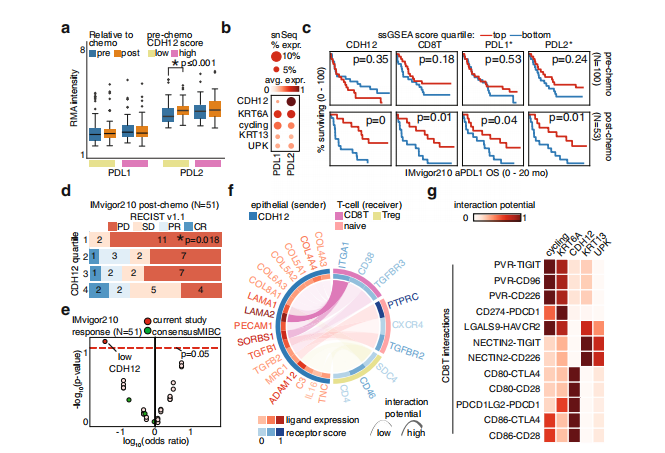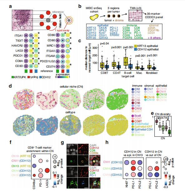 為了驗證CDH12上皮細胞引起T細胞假說(shuō),作者使用Visium空間轉錄組和單細胞核轉錄組研究腫瘤中基因表達定位。CDH12富集的區域也富集了CD8T細胞marker和ITGA1(圖5a)。為了驗證CDH12上皮細胞在單細胞水平上與T細胞共定位,作者設計并使用CODEX平臺對同一腫瘤隊列的腫瘤組織微陣列進(jìn)行了35位免疫組化檢測(圖5b)。