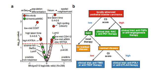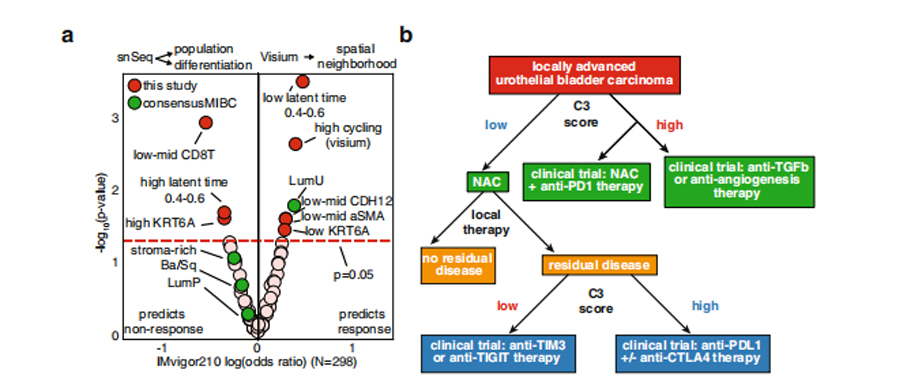 膀胱癌患者接受免疫治療后預后效果的好壞仍然是臨床上面臨的一個(gè)主要的挑戰。近期NC一篇文章通過(guò)單細轉錄組及空間轉錄組闡述了對膀胱癌治療具有反應應答的癌細胞群。獲得了在預測對免疫治療的反應方面更優(yōu)的marker基因。有助于為患者的治療提供更理想更優(yōu)的治療方案。