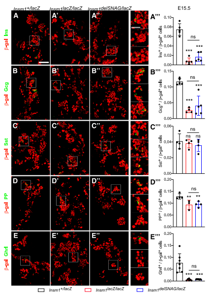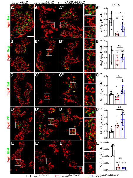通過(guò)β-gal(lacZ等位基因的表達)染色,觀(guān)察到Insm1delSNAG突變體的胰腺在E18.5時(shí)胰島素陽(yáng)性β細胞數量減少,但是沒(méi)有像Insm1 null突變小鼠中那么嚴重(圖1A–A”’)。與對照相比,在Insm1delSNAG或Insm1中沒(méi)有觀(guān)察到α細胞數有變化(圖1B)。同時(shí)發(fā)現和對照相比,在Insm1delSNAG和Insm1-null突變體中觀(guān)察到PP數量的增加和δ細胞的減少(圖1D和E)。然而與對照小鼠相比,Insm1delSNAG突變體中生長(cháng)抑素陽(yáng)性的δ細胞數量顯著(zhù)增加,且在Insm1-null突變體中細胞數減少了(圖1C–C”)。