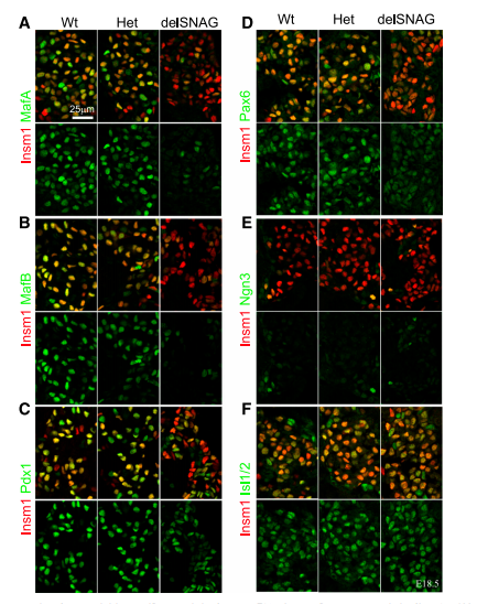 本研究的目的是確定Insm1的SNAG域在胰腺內分泌細胞的發(fā)育中的特異功能。特別是分析了Insm1delSNAG/lacZ(Insm1delSNA突變體),Insm1lacZ/lacZ (Insm1 null突變體)和Insm1+/lacZ(對照) 同窩出生小鼠胚胎的免疫熒光。