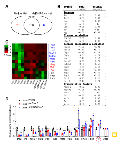 選用E18.5時(shí)Insm1delSNAG,Insm1 null和對照組小鼠的胰腺,利用RNA-seq研究Insm1delSNAG突變體胰臟內的特異性基因表達。分析發(fā)現在Insm1delSNAG突變體胰腺中,共有231個(gè)基因顯著(zhù)失調,這些基因涉及發(fā)育和激素分泌方面。同時(shí)發(fā)現Insm1delSNAG和null 突變有顯著(zhù)的差異基因交集,尤其是編碼激素的基因和與葡萄糖代謝和分泌調節相關(guān)的基因(圖5A、B)。Insm1delSNAG突變體中大約72.7%的差異基因也在Insm1 null突變體中被檢測到。然而與Insm1delSNAG突變體相比,Insm1 null突變體中有著(zhù)更多的基因表達和數量上的變化。這些結果與在Insm1delSNAG突變體中發(fā)現比Insm1null突變體中β細胞更少這一現象一致。