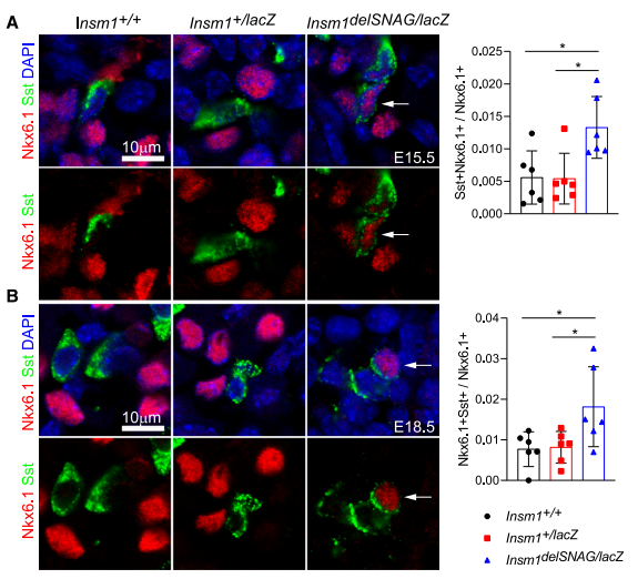 生長(cháng)抑素和胰島素或胰高血糖素的復合染色很少被觀(guān)察到,且在Insm1delSNAG突變體和對照小鼠之間沒(méi)有發(fā)現差異。但是在E15.5和E18.5時(shí)Insm1delSNAG突變體中,檢測到Sst和β細胞特異性轉錄因子Nkx6.1的復合染色信號增強(圖6A、B)。Sst與Nkx6.1的共表達表明Insm1delSNAG中δ細胞有可能會(huì )從β細胞轉化而來(lái)。