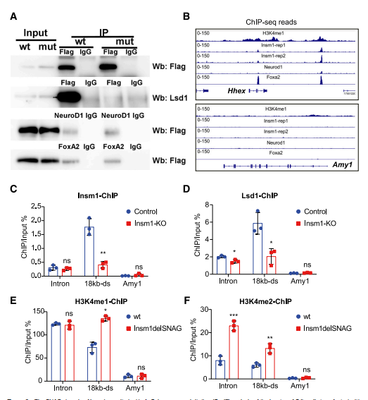 為了進(jìn)一步闡明Insm1的SNAG結構域的分子功能,本研究通過(guò)免疫共沉淀法檢測與Insm1delSNAG相互作用的蛋白。本文檢測到Lsd1無(wú)法在轉染Insm1del-SNAG-Flag的SJb b細胞中被Flag抗體拉下來(lái)(圖8A)。這一結果與先前對垂體細胞的觀(guān)察結果一致。Insm1可以在胰腺β細胞中與NeuroD1和FoxA2互相作用。因此使用NeuroD1和FoxA2抗體在含有Insm1delSNAG-Flag或Insm1-Flag蛋白同一細胞裂解液中進(jìn)行免疫共沉淀,觀(guān)察到Insm1的SNAG域突變并沒(méi)有阻止Insm1與NeuroD1或FoxA2之間的相互作用(圖8A)。因此,Insm1delSNAG突變破壞了Insm1與Lsd1之間的相互作用,但不破壞Insm1與NeuroD1或FoxA2之間的相互作用。