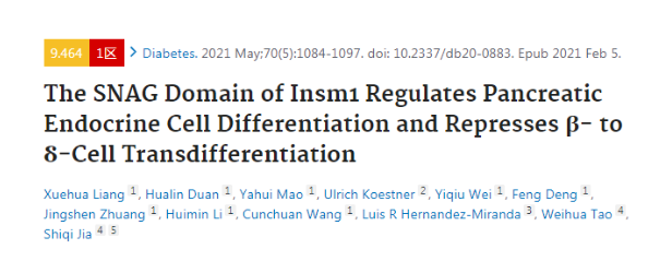 英文題目:The SNAG Domain of Insm1 Regulates Pancreatic Endocrine Cell Differentiation and Represses β- to δ-Cell Transdifferentiation