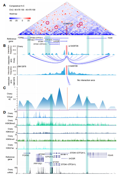 文章探索了卵巢組織的 Hi-C 相互作用并在卵巢組織和 GM12878(作為對照)之間進(jìn)行了比較 Hi-C 圖(圖 1A),發(fā)現 FOXN2、STON1-GTF2A1L、STON1、GTF2A1L 和 FSHR是 rs13405728 (Chr2:48978158) 基因座的假定目標,在卵巢組織中具有相互作用(圖 1B)。