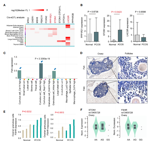 圖F 來(lái)自正常卵巢組織的 rs13405728 位點(diǎn)的 STON1 和 FSHR 的單組織 eQTL 分析。PCOS,多囊卵巢綜合征;eQTL,表達數量性狀基因座。
