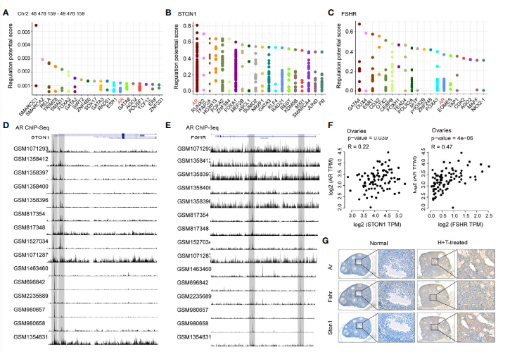 圖5. AR 被鑒定為 STON1 和 FSHR 的共同轉錄因子,并且與卵巢組織中 STON1 和 FSHR 的表達呈正相關(guān)