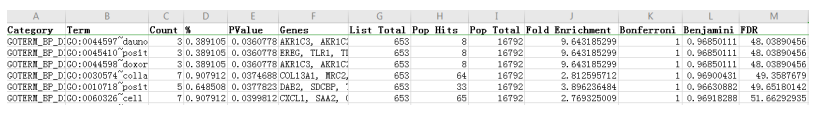 DAVID是一款免費的在線(xiàn)分析軟件,我們只需要準備一列基因名(gene list)。下載其結果,如下圖所示: