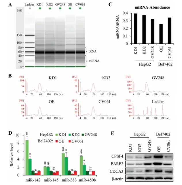 為了測試CPSF4介導的circRNA減少是否會(huì )影響miRNA的穩定性,從CPSF4-OE和CPSF-KD細胞中提取總miRNA,結果顯示CPSF4-OE細胞中miRNA(4-40 nt)和tRNA(40-80 nt)的比率降低,但在CPSF4-KD細胞中增加(圖 3A-C),這證實(shí)了CPSF4能夠減少miRNA的積累。