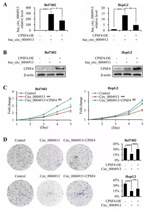 在Bel7402和HepG2細胞中生成hsa_circ_0004913-OE細胞,然后用CPSF4質(zhì)粒轉染。分別通過(guò)蛋白質(zhì)印跡和實(shí)時(shí)PCR檢測每個(gè)細胞系中的CPSF4蛋白和hsa_circ_0004913表達水平(圖 4A,B)。與對照細胞相比,hsa_circ_0004913-OE細胞顯示出較慢的增殖和較低的克隆形成。然而,CPSF4的OE可以消除hsa_circ_0004913的腫瘤抑制作用,因為CPSF4轉染后生長(cháng)速度和克隆形成能力恢復(圖 4C,D)。這些結果表明circRNA在CPSF4介導的HCC細胞腫瘤發(fā)生中的重要作用。