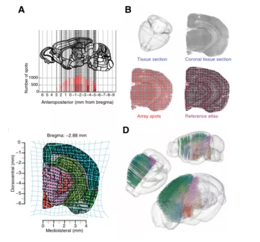 通過(guò)使用全腦空間轉錄組學(xué)基于對空間定義特征的無(wú)偏識別來(lái)生成成年小鼠大腦的系統分類(lèi)。研究發(fā)現分子信息足以推斷大腦的復雜而詳細的神經(jīng)解剖組織結構。無(wú)監督分類(lèi)顯示了特定于區域和層的子區域,在等皮層和海馬體以及紋狀體的新亞區。分子圖譜進(jìn)一步支持了從單細胞RNA圖譜中表征神經(jīng)元的空間特性,并提供了使用最小基因集(大腦調色板)為大腦添加注釋的資源??傊?,本研究建立了一個(gè)分子圖譜來(lái)正式定義大腦區域的空間組織,包括用于映射和靶向離散神經(jīng)解剖結構域的分子代碼,通過(guò)空間維度直觀(guān)詮釋了大腦組織不同空間區域特征,為剖析大腦組織提供了全面的時(shí)空圖譜。