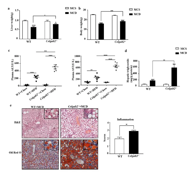 NASH是NAFLD疾病進(jìn)展階段。為了研究 Colgalt2對MCD誘導的脂肪性肝炎的影響,WT和Colgalt2?/?小鼠連續喂食MCD飲食3周。與WT小鼠相比,Colgalt2?/?小鼠的體重和肝臟重量增加(圖3a和b)。在MCD喂養的小鼠中,Colgalt2?/?小鼠的ALT和AST血漿水平及AST均顯著(zhù)升高(圖3 c)。H&E和油紅O染色顯示,MCD喂養的Colgalt2?/?小鼠的肝臟脂肪變性和炎癥浸潤比WT小鼠更嚴重(圖3e)。與此同時(shí),與WT小鼠相比,MCD喂養的Colgalt2?/?小鼠肝臟TG含量顯著(zhù)增加(圖3d)。在MCD飲食組中,Colgalt2?/?小鼠的炎癥評分明顯高于WT小鼠(圖3e)。