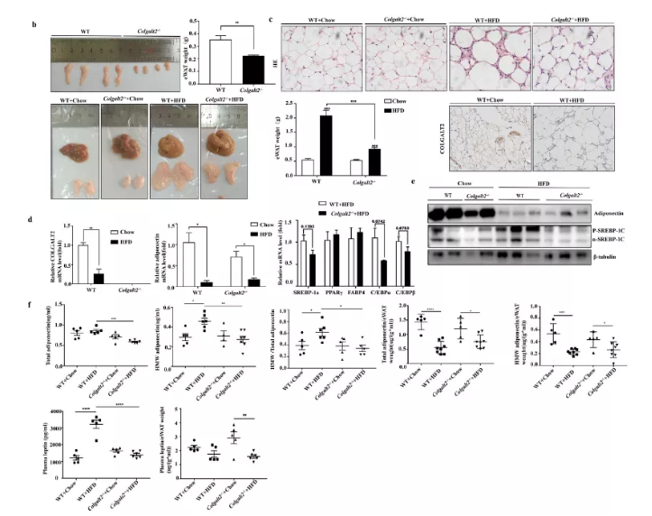 脂聯(lián)素對肝細胞有重要的抗脂肪變性作用。因此,為了檢測Colgalt2對脂聯(lián)素的影響,作者研究了脂聯(lián)素在白色脂肪組織WAT中的表達、血漿總脂聯(lián)素和HMW脂聯(lián)素水平。出人意料的是,在Colgalt2缺陷的小鼠中觀(guān)察到部分脂肪營(yíng)養不良。與WT小鼠相比,Colgalt2?/?小鼠(6周齡)的eWAT體重降低(圖4b)。此外,在HFD喂養16周后,Colgalt2敲除抑制小鼠的脂肪組織擴張,而在WT小鼠脂肪組織明顯體積增大(圖4b)。脂肪形成由復雜的轉錄因子網(wǎng)絡(luò )(C/EBP家族成員,PPARγ,SREBP-1c等) 控制,這些因子在脂聯(lián)素基因表達、代謝和其他脂肪特異性基因中發(fā)揮重要作用。在HFD喂養的Colgalt2?/?小鼠中,C/EBPα、C/EBPβ和脂肪生成標記物SREBP1a有降低趨勢(圖4d)。此外,在HFD喂養的Colgalt2?/?小鼠中,p-SREBP-1c和n-SREBP- 1c蛋白表達明顯下調(圖4e)。