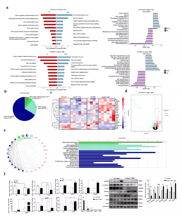 為了探索NAFLD中Colgalt2缺乏的潛在機制,作者對WT小鼠和飼喂HFD或標準飼料的Colgalt2?/?小鼠肝組織進(jìn)行ONT全長(cháng)轉錄組測序。結果顯示,與WT小鼠相比,HFD喂養的Colgalt2?/?小鼠中有321個(gè)DEGs。為了明確DEGs的功能,分別對上調和下調的 DEGs進(jìn)行KEGG通路富集分析(P < 0.05) (圖5a)。對于上調的基因,KEGG分析顯示這些差異表達基因顯著(zhù)富集于MAPK信號通路、NAFLD、和氧化磷酸化。下調的基因富集于脂肪消化和吸收、甘油脂代謝。在這些途徑中,19個(gè)差異表達基因與脂代謝密切相關(guān),包括adipoR1、adipoR2和脂質(zhì)合成相關(guān)的分子,包括Cidea和Cidec (FSP27)、Cd36和PPARγ(圖5c)。為了進(jìn)一步研究這19個(gè)基因在這些通路中的作用,使用ClueGO和CluePedia工具解讀這些通路網(wǎng)絡(luò )(圖5 d)。這些基因在A(yíng)MPK信號通路、脂肪細胞因子信號通路和NAFLD等中富集(圖5 b和e)。