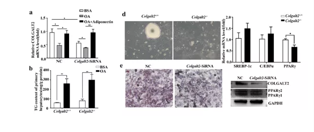 為了探究COLGALT2缺乏在脂肪萎縮中的作用, 在3T3-L1細胞中誘導了前脂肪細胞分化,從Colgalt2?/?和WT小鼠的eWAT中分離原代前脂肪細胞(圖6d)。油紅 O染色結果顯示干擾Colgalt2降低了前脂肪細胞分化為脂肪細胞(圖6e)。此外,干擾Colgalt2下調了脂肪前細胞向脂肪細胞分化過(guò)程中PPARγ的表達(圖6e)。此外,從Colgalt2?/?和WT小鼠的eWAT中分離出原代前脂肪細胞,結果顯示,Colgalt2敲除降低了PPARγ mRNA水平(圖6d)。然而,來(lái)自Colgalt2?/?和WT小鼠的原代前脂肪細胞分化后,C/EBPα、C/EBPβ或SREBP-1c mRNA水平無(wú)顯著(zhù)差異。