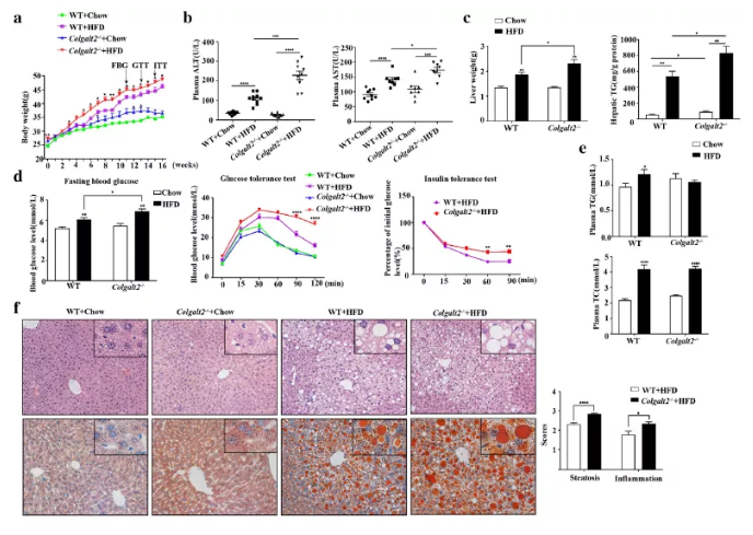 血液ALT和AST水平表明HFD喂養的Colgalt2?/?小鼠的肝損傷加重。HFD喂養的Colgalt2?/?小鼠血漿中ALT和AST水平分別比WT小鼠高2倍和1.2倍(圖2b)。然而,HFD喂養的Colgalt2?/?小鼠和WT小鼠的血漿TG、TC和HDL水平?jīng)]有顯著(zhù)差異(圖2e)。此外,空腹血糖(FBG)、GTT和ITT表明HFD小鼠的胰島素敏感性受損(圖2c)。在HFD喂養的小鼠中,與WT小鼠相比Colgalt2?/?小鼠的FBG水平在11周后增加了13%(圖2c)。GTT和ITT檢測發(fā)現HFD小鼠的循環(huán)葡萄糖水平高于正常飼料喂養的小鼠,且在Colgalt2敲除小鼠中也明顯增加(圖2c)。