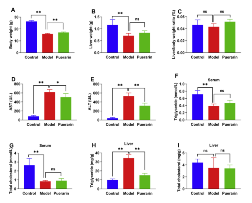 如圖1A-C所示,4周MCD喂養小鼠后,小鼠體重和肝臟體重顯著(zhù)下降。葛根素治療可顯著(zhù)減輕體重損失,但對肝臟重量沒(méi)有影響。但3個(gè)試驗組的肝/體質(zhì)量比無(wú)顯著(zhù)差異。ALT和AST通常用于評估肝細胞損傷。與對照組相比,NASH模型組血清ALT、AST活性顯著(zhù)升高,TG、TC明顯降低。葛根素補充消除了血清中谷丙轉氨酶和谷草轉氨酶的升高,但對血清中TC和TG沒(méi)有影響(圖1D G)。在MCD飲食誘導的NASH小鼠中,觀(guān)察到肝臟TG含量顯著(zhù)升高,而葛根素治療則阻止了這種積累。肝TC含量各組間無(wú)差異(圖1H I)。MCD飼料喂養的模型小鼠與正常小鼠相比,肝切片的H&E和 Oil Red O染色顯示,肝切片出現微泡和大泡性脂肪變性,并伴有炎癥細胞浸潤和肝細胞球化。